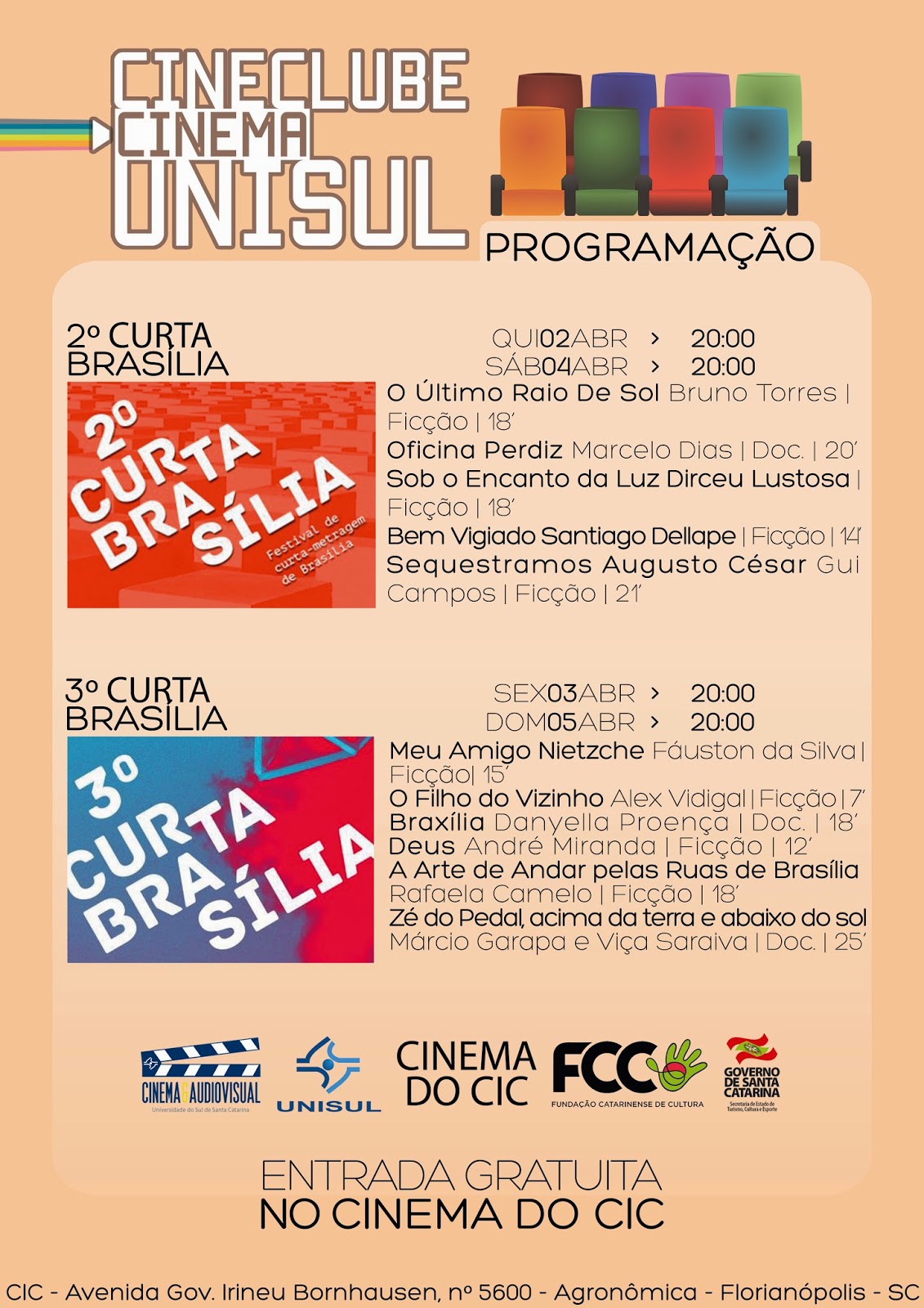Onde: Centro Integrado de Cultura (CIC) Endereço: Av. Governador Irineu Bornhausen, 5600 - Agronômica Quanto: Gratuito O Cinema do Centro Integrado de Cultura (CIC) tem sessões gratuitas todas as semanas, de quinta-feira a domingo, sempre às 20h. A realização é uma parceria entre Fundação Catarinense de Cultura (FCC) e o curso de graduação de Cinema da Unidade Pedra Branca, da Universidade do Sul de Santa Catarina (Unisul). Confira a programação para o mês de abril: